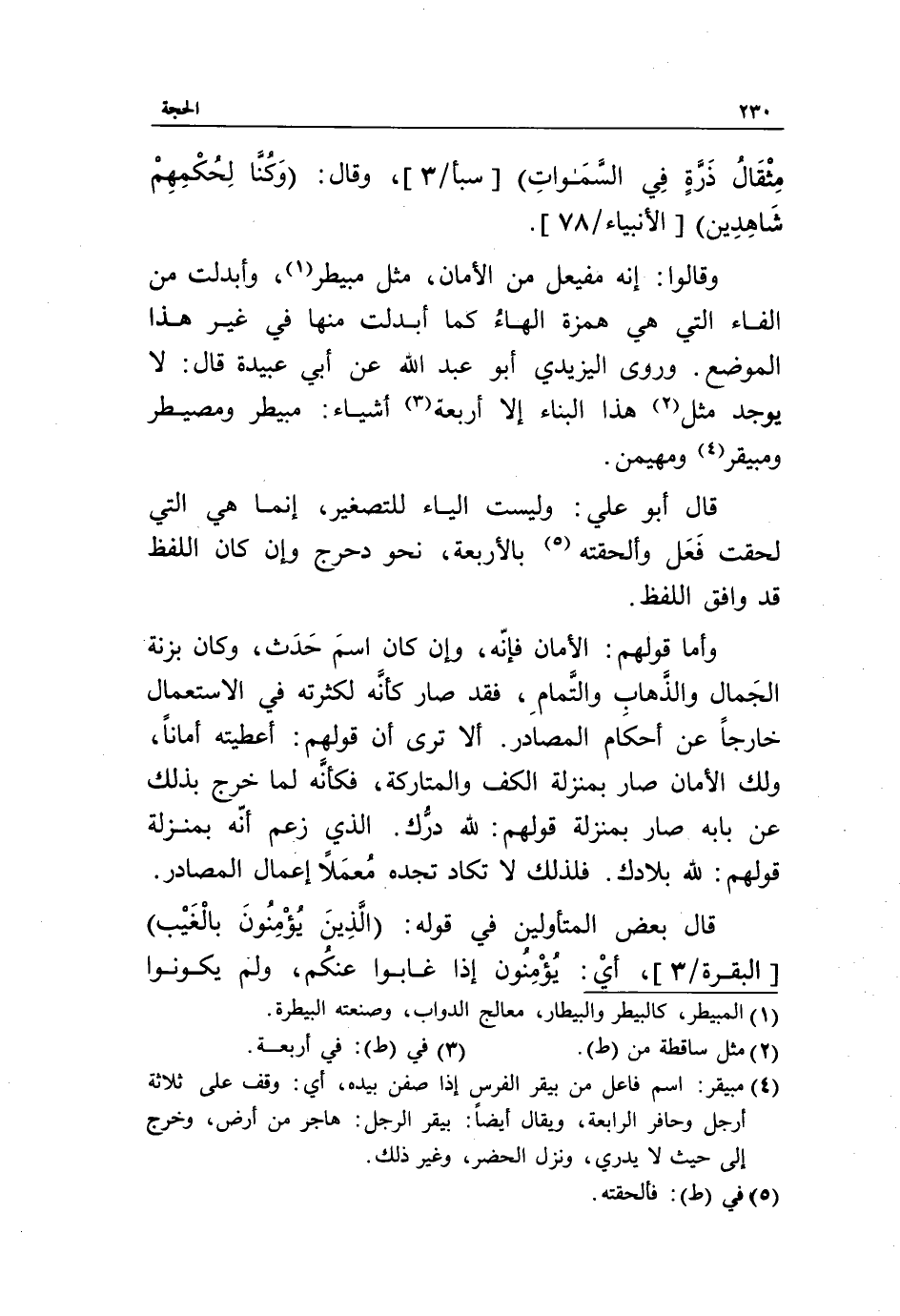 وقالوا: إنه مفيعل من الأمان، مثل مبيطر «1»، وأبدلت من الفاء التي هي همزة الهاء كما أبدلت منها في غير هذا الموضع. وروى اليزيدي أبو عبد الله عن أبي عبيدة قال: لا يوجد مثل «2» هذا البناء إلا أربعة «3» أشياء: مبيطر ومصيطر ومبيقر «4» ومهيمن.