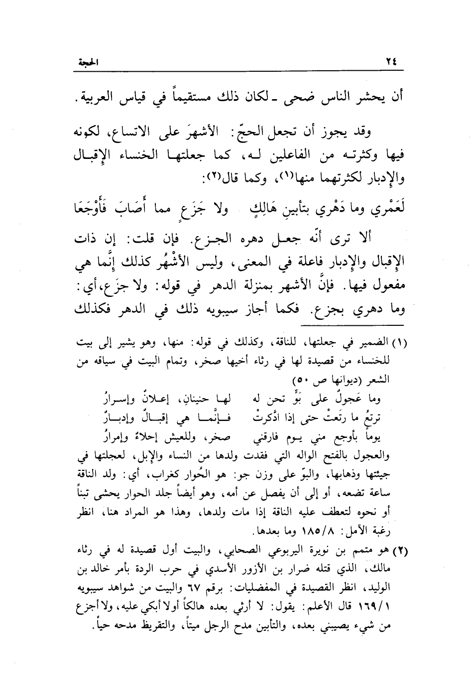 وقد يجوز أن تجعل الحجّ: الأشهر على الاتساع، لكونه فيها وكثرته من الفاعلين له، كما جعلتها الخنساء الإقبال والإدبار لكثرتهما منها «1»، وكما قال «2»: