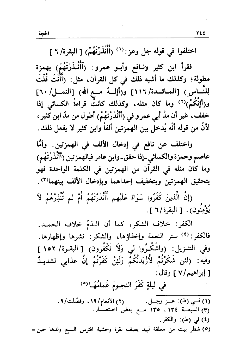 واختلف عن نافع في إدخال الألف في الهمزتين. وأمّا عاصم وحمزة والكسائي- إذا حقق- وابن عامر فبالهمزتين أَأَنْذَرْتَهُمْ وما كان مثله في القرآن من الهمزتين في الكلمة الواحدة فهو بتحقيق الهمزتين وبتخفيف إحداهما وبإدخال الألف بينهما «3».