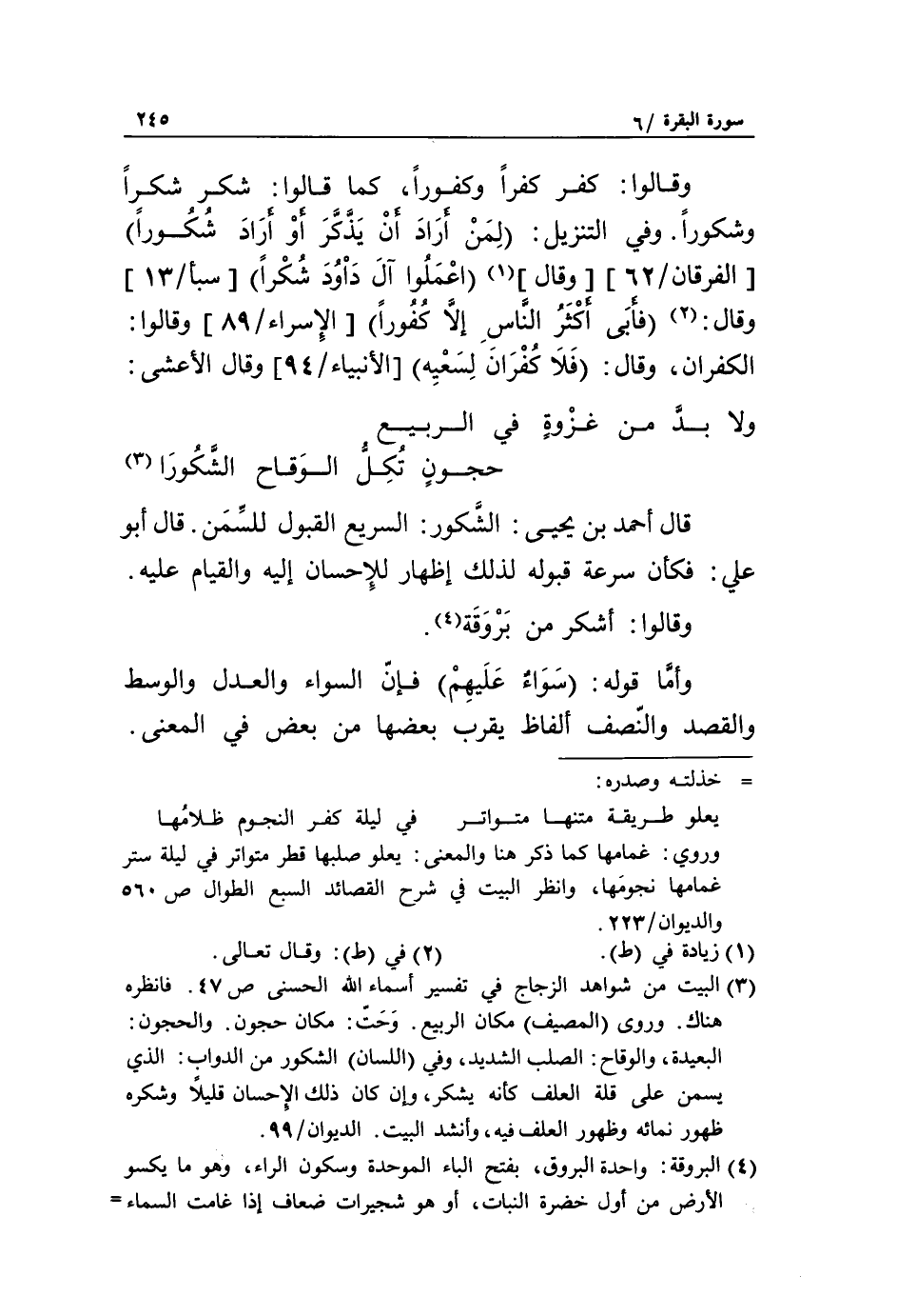 «3» قال أحمد بن يحيى: الشّكور: السريع القبول للسّمن. قال أبو علي: فكأن سرعة قبوله لذلك إظهار للإحسان إليه والقيام عليه.