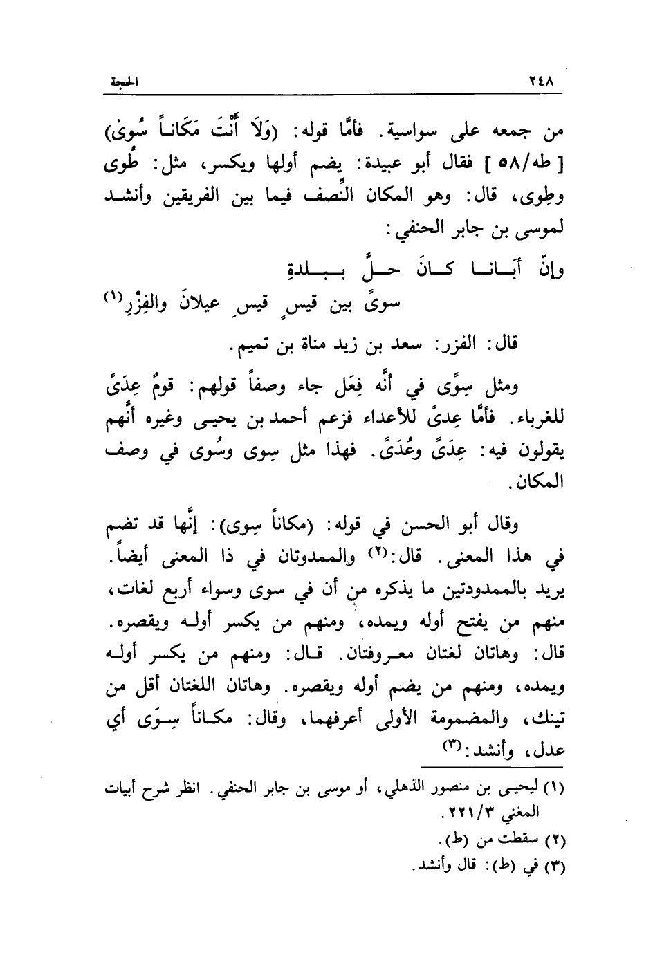 وقال أبو الحسن في قوله: (مكانا سوى): إنّها قد تضم في هذا المعنى. قال: «2» والممدودتان في ذا المعنى أيضا.