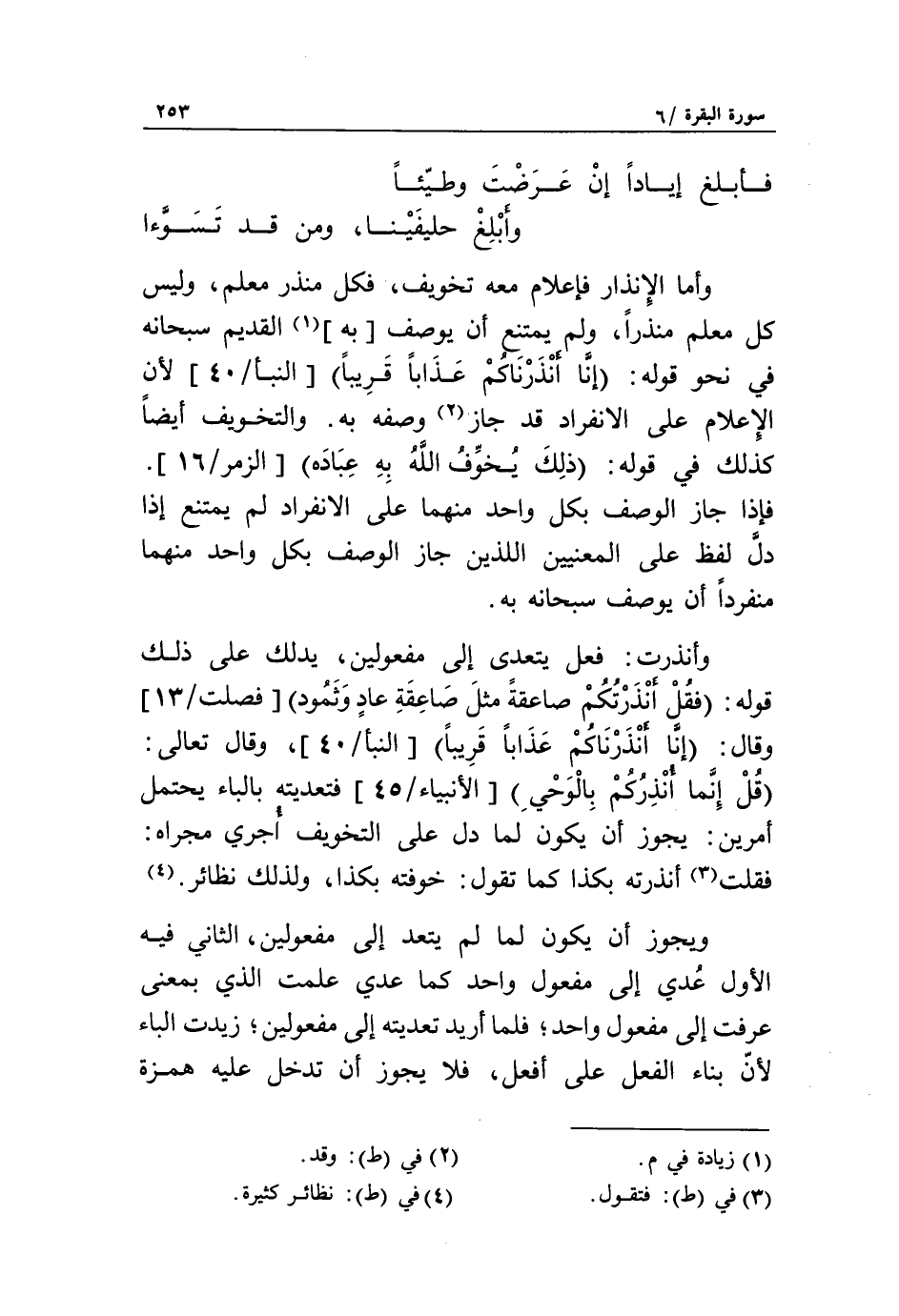 قُلْ إِنَّما أُنْذِرُكُمْ بِالْوَحْيِ [الأنبياء/ 45] فتعديته بالباء يحتمل أمرين: يجوز أن يكون لما دل على التخويف أجري مجراه: