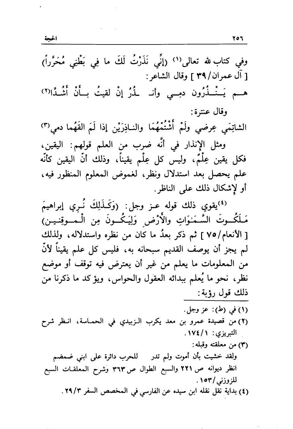 «3» ومثل الإنذار في أنّه ضرب من العلم قولهم: اليقين، فكل يقين علم، وليس كل علم يقينا، وذلك أنّ اليقين كأنّه علم يحصل بعد استدلال ونظر، لغموض المعلوم المنظور فيه، أو لإشكال ذلك على الناظر.