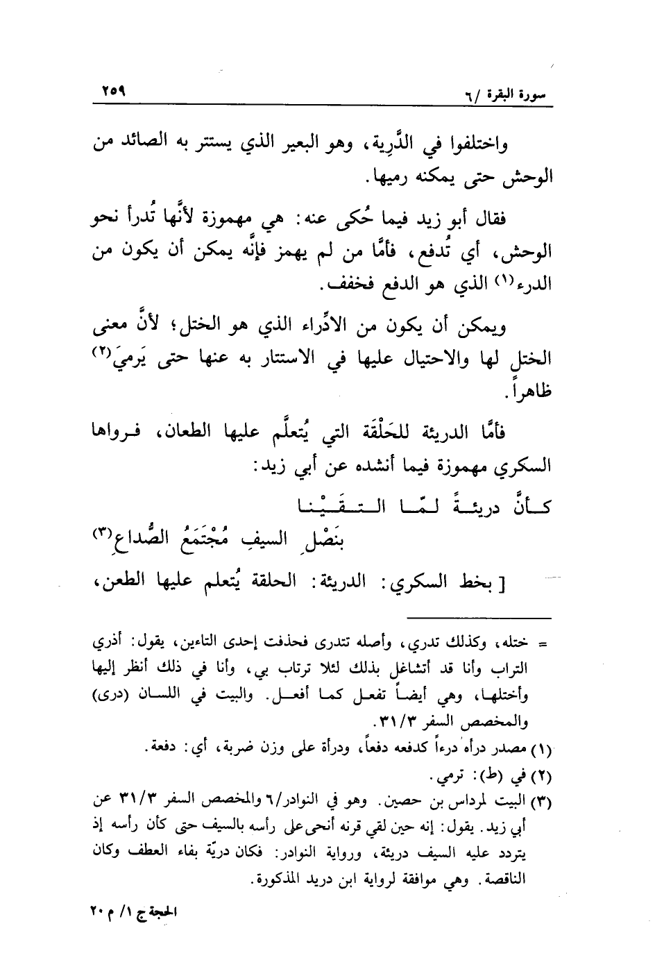 فقال أبو زيد فيما حكى عنه: هي مهموزة لأنّها تدرأ نحو الوحش، أي تدفع، فأمّا من لم يهمز فإنّه يمكن أن يكون من الدرء «1» الذي هو الدفع فخفف.