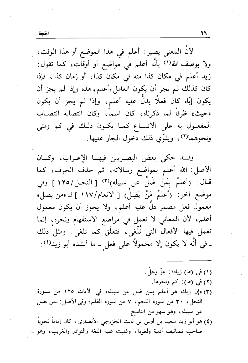 وقد حكى بعض البصريين فيها الإعراب، وكان الأصل: الله أعلم بمواضع رسالاته، ثم حذف الحرف، كما قال: أَعْلَمُ بِمَنْ ضَلَّ عَنْ سَبِيلِهِ «3» [النحل/ 125] وفي موضع آخر: أَعْلَمُ مَنْ يَضِلُّ [الانعام/ 117] ف «من يضل» معمول فعل مضمر دلّ عليه أعلم، ولا يجوز أن يكون معمول أعلم، لأن المعاني لا تعمل في مواضع الاستفهام ونحوه، إنما تعمل فيها الأفعال التي تلغى، فتعلّق كما تلغى. ومثل ذلك- في أنّه لا يكون إلا محمولا على فعل- ما أنشده أبو زيد «4»: