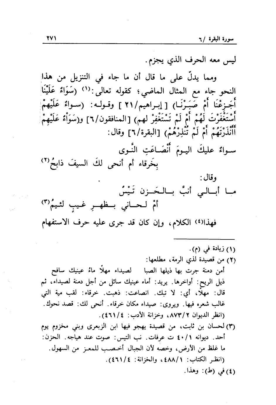 ومما يدلّ على ما قال أن ما جاء في التنزيل من هذا النحو جاء مع المثال الماضي، كقوله تعالى: «1» سَواءٌ عَلَيْنا أَجَزِعْنا أَمْ صَبَرْنا [إبراهيم/ 21] وقوله: سَواءٌ عَلَيْهِمْ أَسْتَغْفَرْتَ لَهُمْ أَمْ لَمْ تَسْتَغْفِرْ لَهُمْ [المنافقون/ 6] وسَواءٌ عَلَيْهِمْ أَأَنْذَرْتَهُمْ أَمْ لَمْ تُنْذِرْهُمْ [البقرة/ 6] وقال: