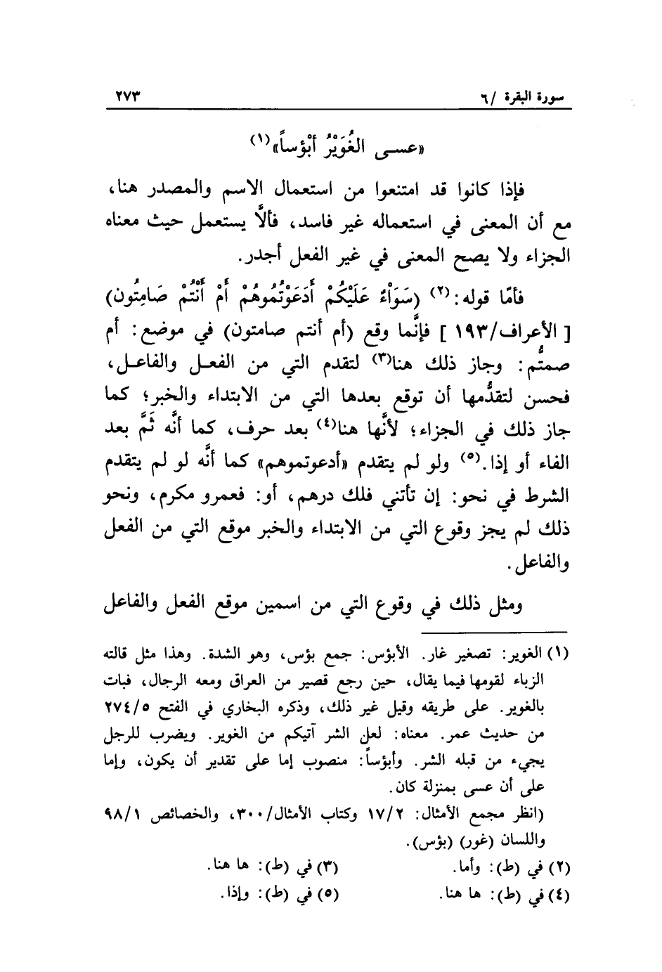 «عسى الغوير أبؤسا» «1» فإذا كانوا قد امتنعوا من استعمال الاسم والمصدر هنا، مع أن المعنى في استعماله غير فاسد، فألّا يستعمل حيث معناه الجزاء ولا يصح المعنى في غير الفعل أجدر.