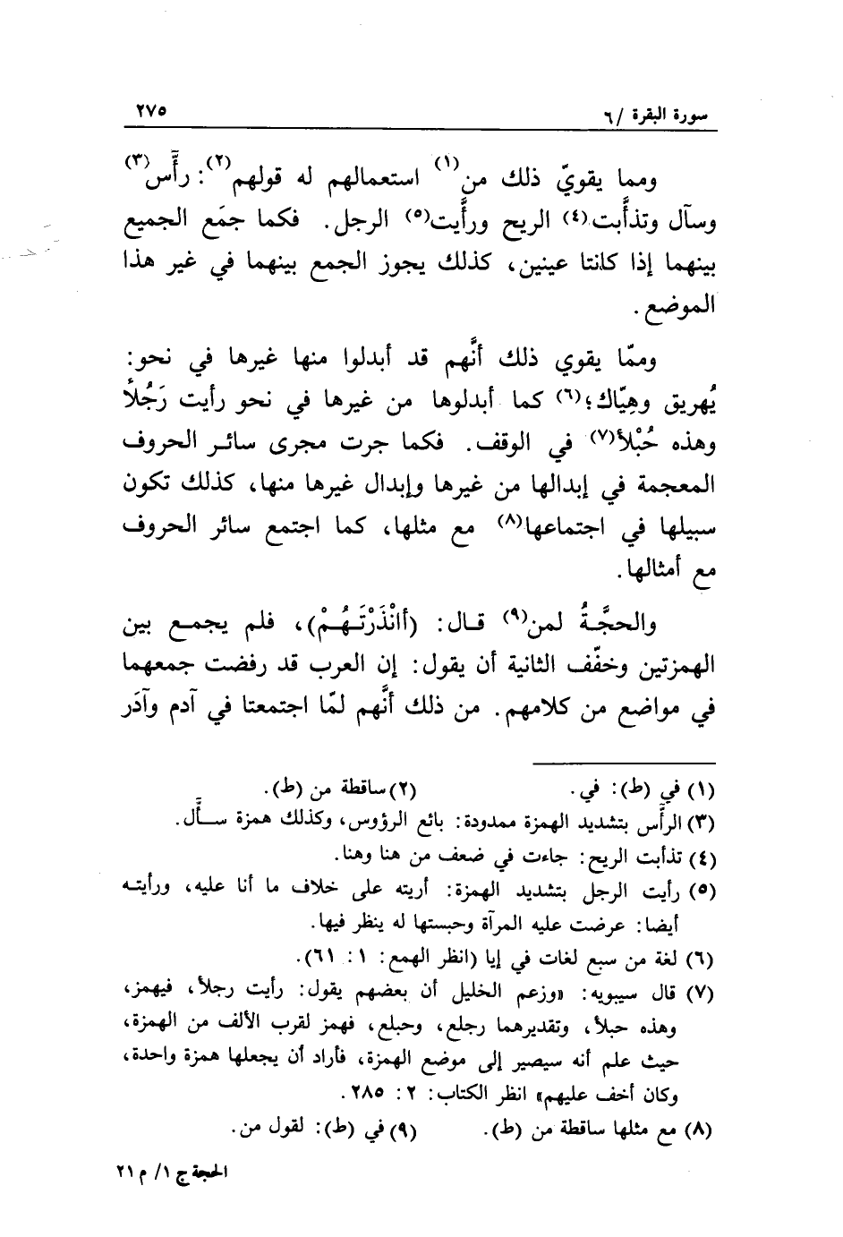 (7) قال سيبويه: «وزعم الخليل أن بعضهم يقول: رأيت رجلأ، فيهمز، وهذه حبلأ، وتقديرهما رجلع، وحبلع، فهمز لقرب الألف من الهمزة، حيث علم أنه سيصير إلى موضع الهمزة، فأراد أن يجعلها همزة واحدة، وكان أخف عليهم» انظر الكتاب: 2: 285.