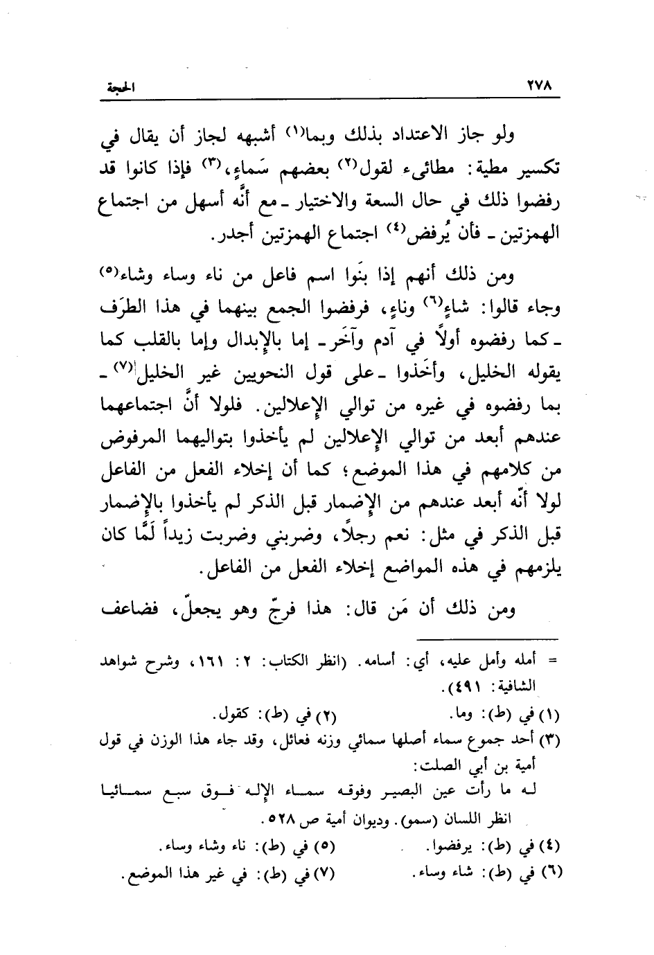 ولو جاز الاعتداد بذلك وبما «1» أشبهه لجاز أن يقال في تكسير مطية: مطائي لقول «2» بعضهم سماء، «3» فإذا كانوا قد رفضوا ذلك في حال السعة والاختيار- مع أنّه أسهل من اجتماع الهمزتين- فأن يرفض «4» اجتماع الهمزتين أجدر.