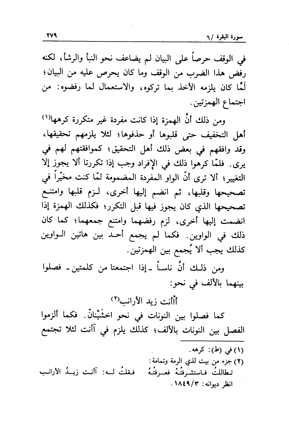 في الوقف حرصا على البيان لم يضاعف نحو النبأ والرشإ، لكنه رفض هذا الضرب من الوقف وما كان يحرص عليه من البيان، لمّا كان يلزمه الأخذ بما تركوه، والاستعمال لما رفضوه: من اجتماع الهمزتين.