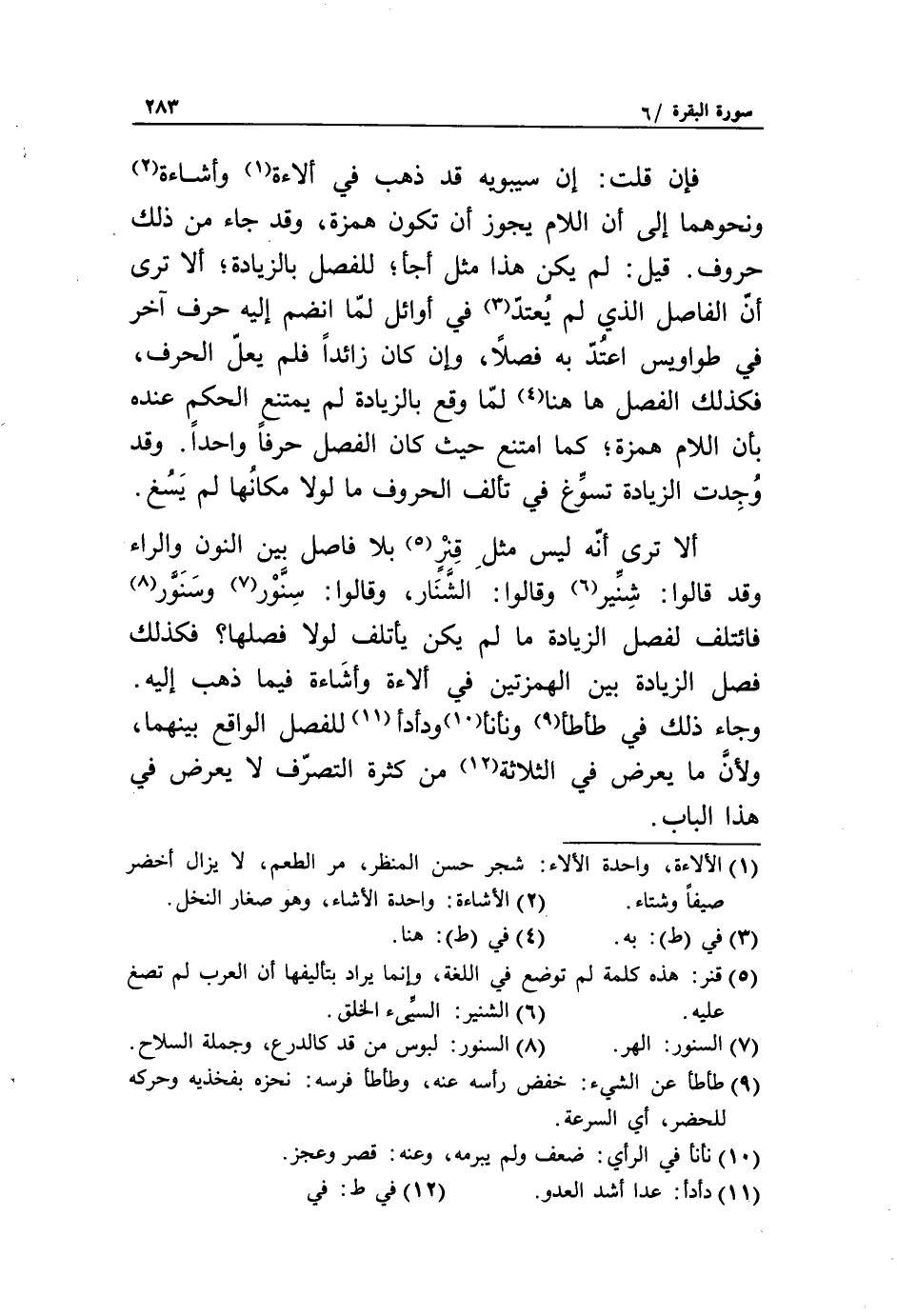ألا ترى أنّه ليس مثل قنر «5» بلا فاصل بين النون والراء وقد قالوا: شنّير «6» وقالوا: الشّنار، وقالوا: سنّور «7» وسنوّر «8» فائتلف لفصل الزيادة ما لم يكن يأتلف لولا فصلها؟ فكذلك فصل الزيادة بين الهمزتين في ألاءة وأشاءة فيما ذهب إليه.
