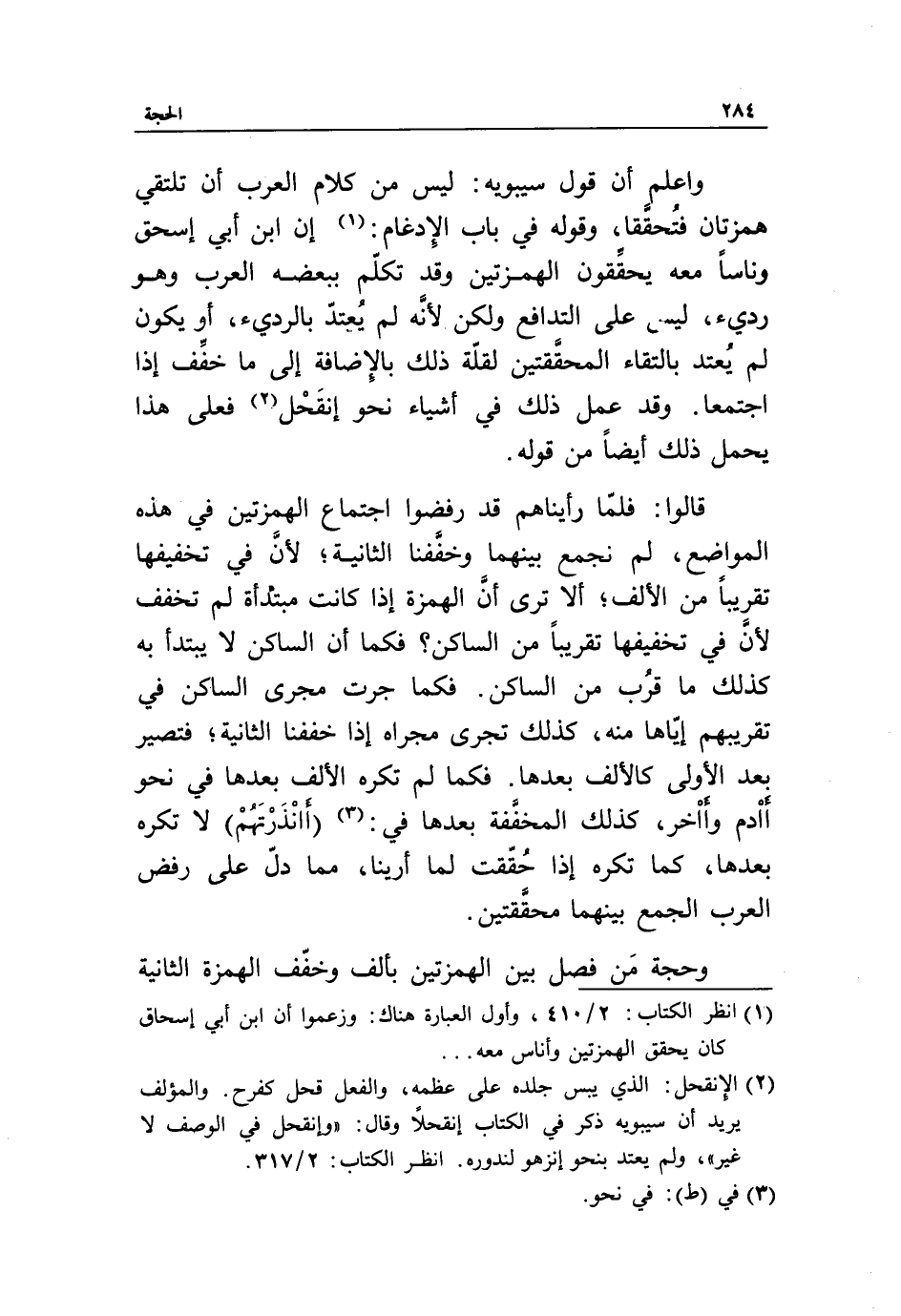 واعلم أن قول سيبويه: ليس من كلام العرب أن تلتقي همزتان فتحقّقا، وقوله في باب الإدغام: «1» إن ابن أبي إسحاق وناسا معه يحقّقون الهمزتين وقد تكلّم ببعضه العرب وهو رديء، ليس على التدافع ولكن لأنّه لم يعتدّ بالرديء، أو يكون لم يعتد بالتقاء المحقّقتين لقلّة ذلك بالإضافة إلى ما خفّف إذا اجتمعا. وقد عمل ذلك في أشياء نحو انقحل «2» فعلى هذا يحمل ذلك أيضا من قوله.