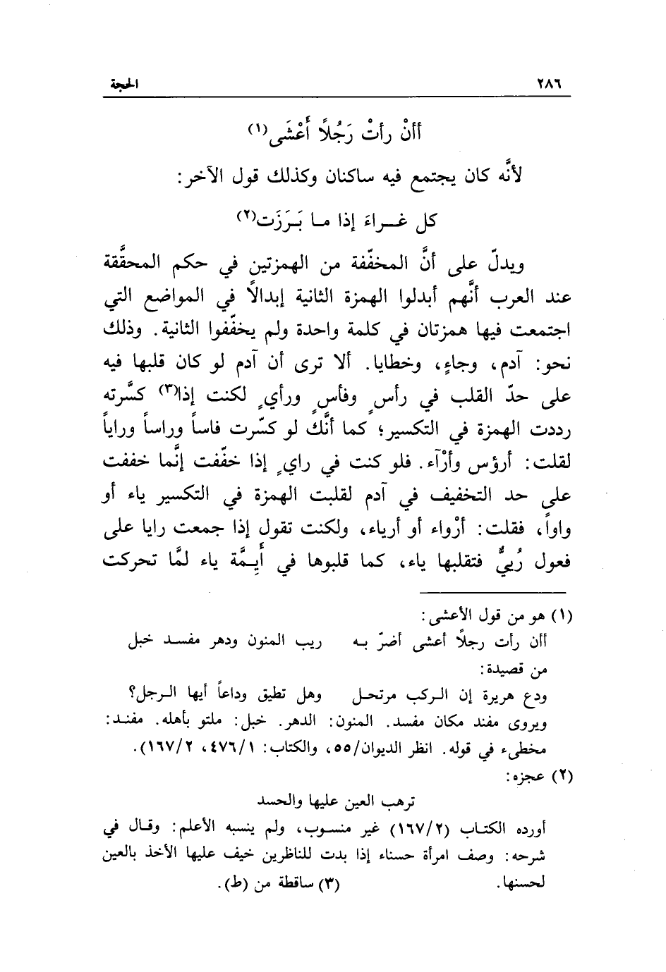 كل غراء إذا ما برزت «2» ويدلّ على أنّ المخفّفة من الهمزتين في حكم المحقّقة عند العرب أنّهم أبدلوا الهمزة الثانية إبدالا في المواضع التي اجتمعت فيها همزتان في كلمة واحدة ولم يخفّفوا الثانية. وذلك نحو: آدم، وجاء، وخطايا. ألا ترى أن آدم لو كان قلبها فيه على حدّ القلب في رأس وفأس ورأي لكنت إذا «3» كسّرته رددت الهمزة في التكسير، كما أنّك لو كسّرت فاسا وراسا ورايا لقلت: أرؤس وأرآء. فلو كنت في راي إذا خفّفت إنّما خففت على حد التخفيف في آدم لقلبت الهمزة في التكسير ياء أو واوا، فقلت: أرواء أو أرياء، ولكنت تقول إذا جمعت رايا على فعول رييّ فتقلبها ياء، كما قلبوها في أيمّة ياء لمّا تحركت