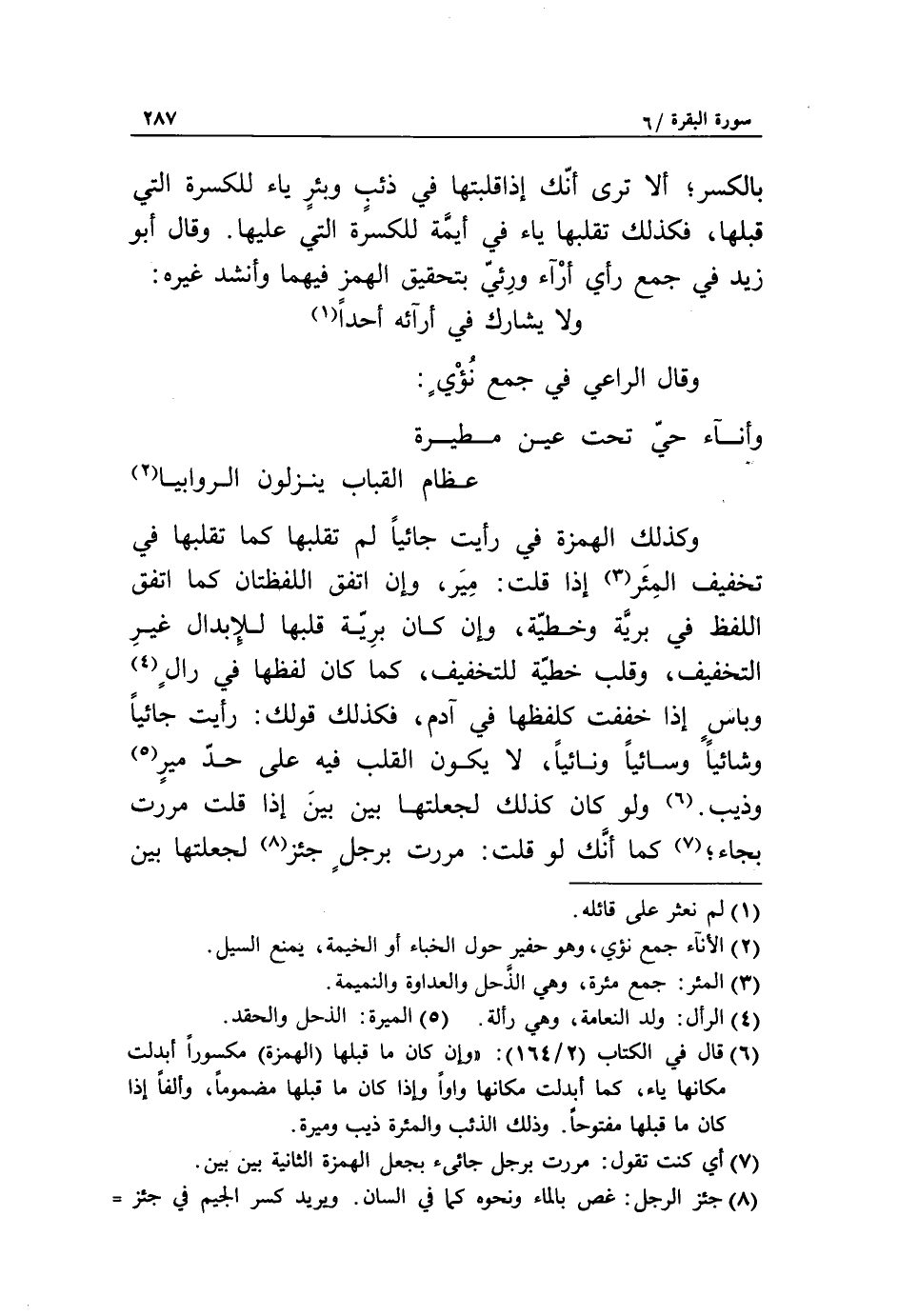 (7) أي كنت تقول: مررت برجل جائئ بجعل الهمزة الثانية بين بين.