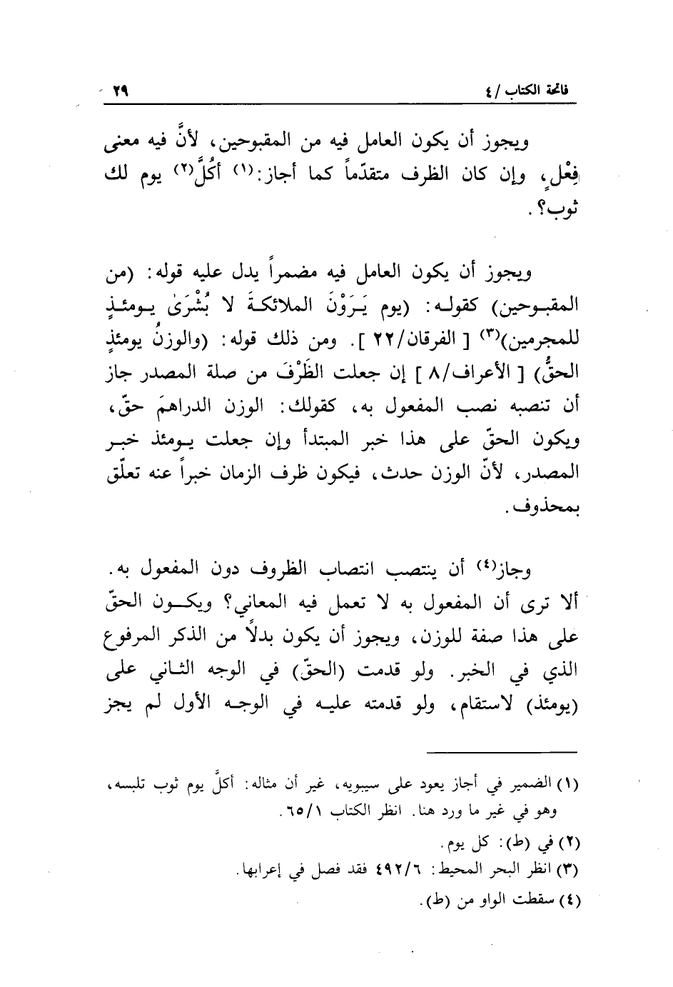 (1) الضمير في أجاز يعود على سيبويه، غير أن مثاله: أكلّ يوم ثوب تلبسه، وهو في غير ما ورد هنا. انظر الكتاب 1/ 65.