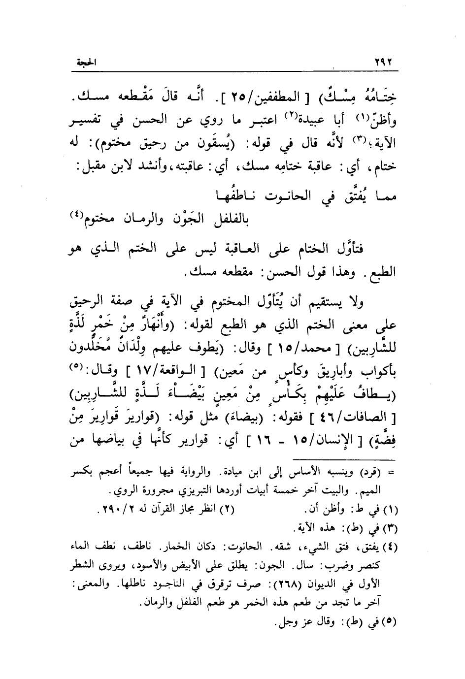 ولا يستقيم أن يتأوّل المختوم في الآية في صفة الرحيق على معنى الختم الذي هو الطبع لقوله: وَأَنْهارٌ مِنْ خَمْرٍ لَذَّةٍ لِلشَّارِبِينَ [محمد/ 15] وقال: يَطُوفُ عَلَيْهِمْ وِلْدانٌ مُخَلَّدُونَ بِأَكْوابٍ وَأَبارِيقَ وَكَأْسٍ مِنْ مَعِينٍ [الواقعة/ 17] وقال: «5» يُطافُ عَلَيْهِمْ بِكَأْسٍ مِنْ مَعِينٍ بَيْضاءَ لَذَّةٍ لِلشَّارِبِينَ [الصافات/ 46] فقوله: (بيضاء) مثل قوله: قواريرا قواريرا من فضة [الإنسان/ 15 - 16] أي: قوارير كأنّها في بياضها من