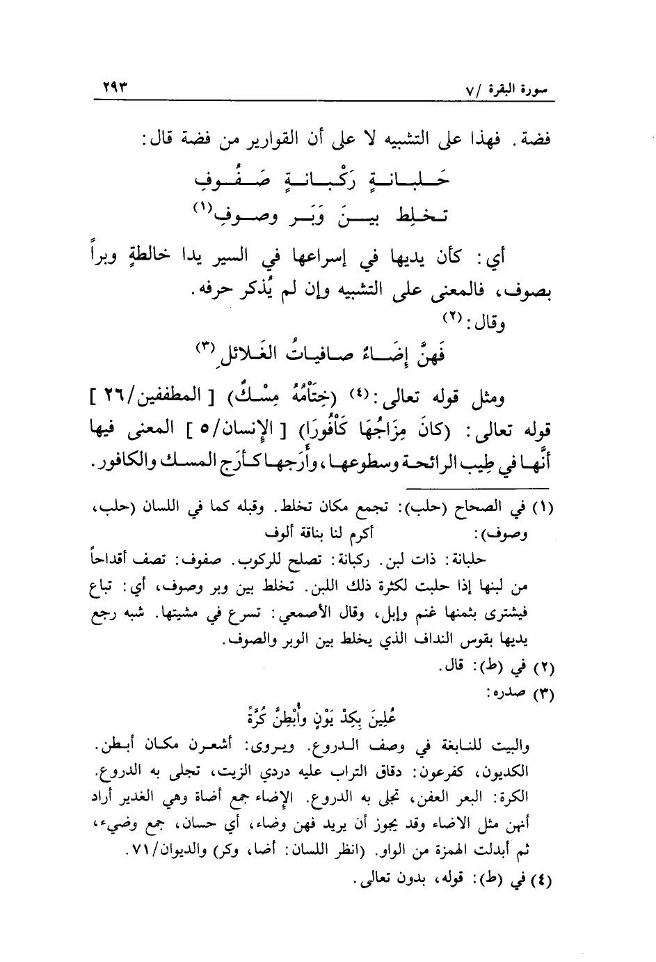 (1) في الصحاح (حلب): تجمع مكان تخلط. وقبله كما في اللسان (حلب، وصوف): أكرم لنا بناقة ألوف حلبانة: ذات لبن. ركبانة: تصلح للركوب. صفوف: تصف أقداحا من لبنها إذا حلبت لكثرة ذلك اللبن. تخلط بين وبر وصوف، أي: تباع فيشترى بثمنها غنم وإبل، وقال الأصمعي: تسرع في مشيتها. شبه رجع يديها بقوس النداف الذي يخلط بين الوبر والصوف.