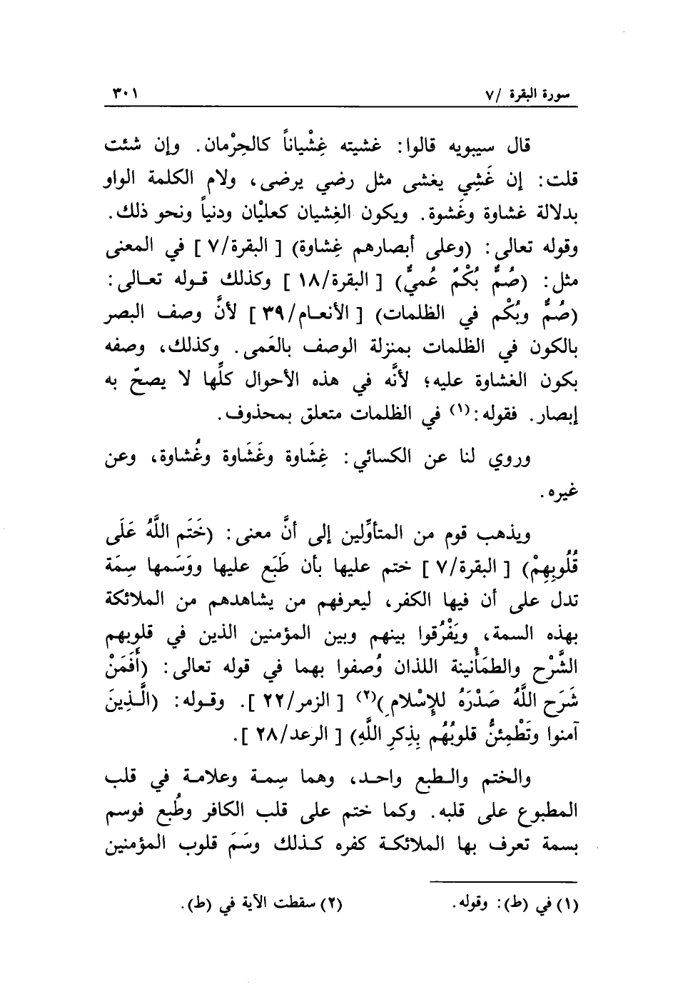 ويذهب قوم من المتأوّلين إلى أنّ معنى: خَتَمَ اللَّهُ عَلى قُلُوبِهِمْ [البقرة/ 7] ختم عليها بأن طبع عليها ووسمها سمة تدل على أن فيها الكفر، ليعرفهم من يشاهدهم من الملائكة بهذه السمة، ويفرقوا بينهم وبين المؤمنين الذين في قلوبهم الشّرح والطمأنينة اللذان وصفوا بهما في قوله تعالى: أَفَمَنْ شَرَحَ اللَّهُ صَدْرَهُ لِلْإِسْلامِ «2» [الزمر/ 22]. وقوله: الَّذِينَ آمَنُوا وَتَطْمَئِنُّ قُلُوبُهُمْ بِذِكْرِ اللَّهِ [الرعد/ 28].