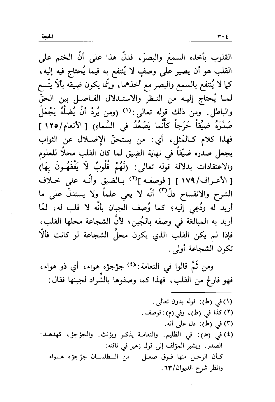 القلوب بأخذه السمع والبصر، فدلّ هذا على أنّ الختم على القلب هو أن يصير على وصف لا ينتفع به فيما يحتاج فيه إليه، كما لا ينتفع بالسمع والبصر مع أخذهما، وإنّما يكون ضيقه بألّا يتّسع لما يحتاج إليه من النظر والاستدلال الفاصل بين الحقّ والباطل. ومن ذلك قوله تعالى: «1» وَمَنْ يُرِدْ أَنْ يُضِلَّهُ يَجْعَلْ صَدْرَهُ ضَيِّقاً حَرَجاً كَأَنَّما يَصَّعَّدُ فِي السَّماءِ [الأنعام/ 125] فهذا كلام كالمثل، أي: من يستحقّ الإضلال عن الثواب يجعل صدره ضيّقا في نهاية الضيق لما كان القلب محلا للعلوم والاعتقادات بدلالة قوله تعالى: لَهُمْ قُلُوبٌ لا يَفْقَهُونَ بِها [الأعراف/ 179] [فوصفه] «2» بالضيق وأنّه على خلاف الشرح والانفساح دلّ «3» أنّه لا يعي علما ولا يستدلّ على ما أريد له ودعي إليه، كما وصف الجبان بأنّه لا قلب له، لمّا أريد به المبالغة في وصفه بالجبن، لأنّ الشجاعة محلها القلب، فإذا لم يكن القلب الذي يكون محلّ الشجاعة لو كانت فألّا تكون الشجاعة أولى.
