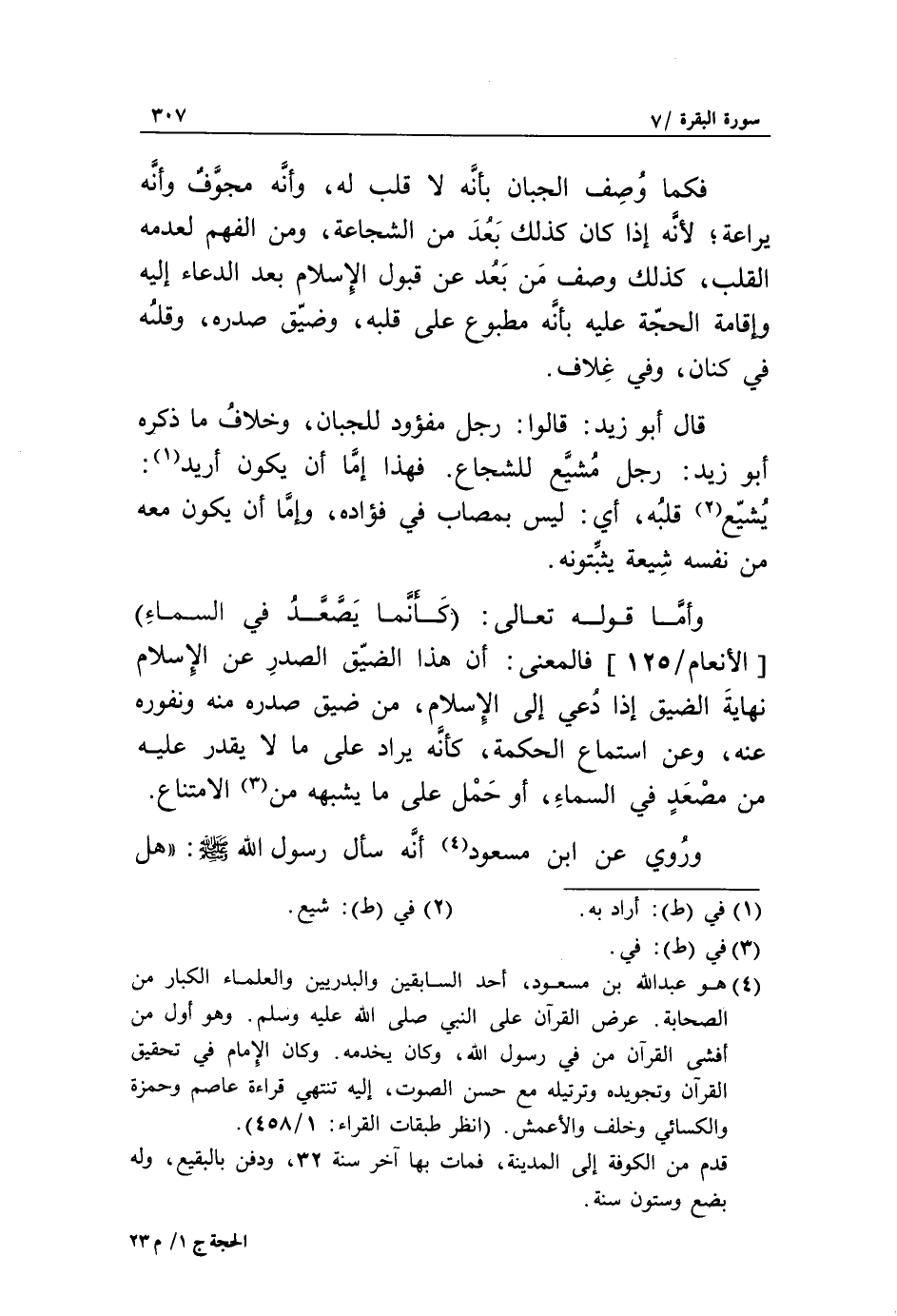 (4) هو عبد الله بن مسعود، أحد السابقين والبدريين والعلماء الكبار من الصحابة. عرض القرآن على النبي صلّى الله عليه وسلّم. وهو أول من أفشى القرآن من في رسول الله، وكان يخدمه. وكان الإمام في تحقيق القرآن وتجويده وترتيله مع حسن الصوت، إليه تنتهي قراءة عاصم وحمزة والكسائي وخلف والأعمش. (انظر طبقات القراء: 1/ 458).