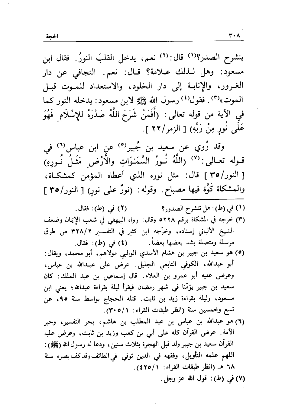 فقول «4» رسول الله صلّى الله عليه وسلّم لابن مسعود: يدخله النور كما في الآية من قوله تعالى: أَفَمَنْ شَرَحَ اللَّهُ صَدْرَهُ لِلْإِسْلامِ فَهُوَ عَلى نُورٍ مِنْ رَبِّهِ [الزمر/ 22].