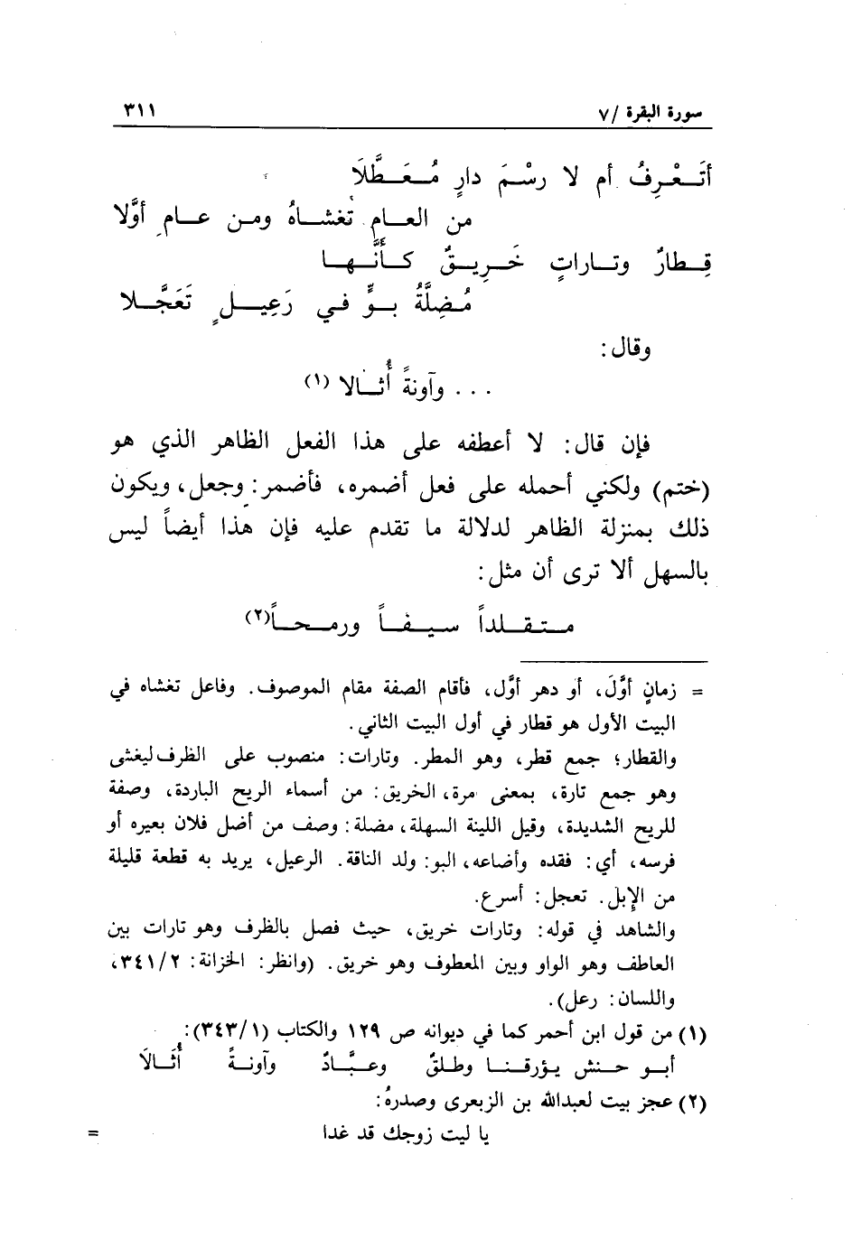 ... وآونة أثالا «1» فإن قال: لا أعطفه على هذا الفعل الظاهر الذي هو (ختم) ولكني أحمله على فعل أضمره، فأضمر: وجعل، ويكون ذلك بمنزلة الظاهر لدلالة ما تقدم عليه فإن هذا أيضا ليس بالسهل ألا ترى أن مثل: