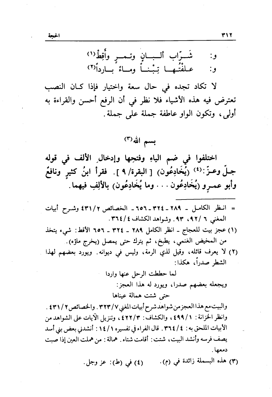 بسم الله «3» اختلفوا في ضم الياء وفتحها وإدخال الألف في قوله جلّ وعزّ: «4» يُخادِعُونَ [البقرة/ 9]. فقرأ ابن كثير ونافع وأبو عمرو (يخادعون ... وما يخادعون) بالألف فيهما.