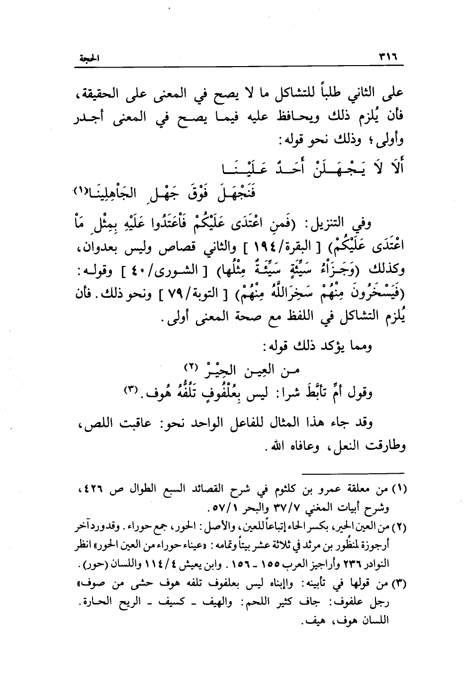 «1» وفي التنزيل: فَمَنِ اعْتَدى عَلَيْكُمْ فَاعْتَدُوا عَلَيْهِ بِمِثْلِ مَا اعْتَدى عَلَيْكُمْ [البقرة/ 194] والثاني قصاص وليس بعدوان، وكذلك وَجَزاءُ سَيِّئَةٍ سَيِّئَةٌ مِثْلُها [الشورى/ 40] وقوله: