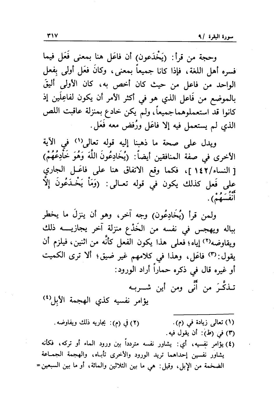 ولمن قرأ (يخادعون) وجه آخر، وهو أن ينزل ما يخطر بباله ويهجس في نفسه من الخدع منزلة آخر يجازيه ذلك ويقاوضه «2» إياه، فعلى هذا يكون الفعل كأنّه من اثنين، فيلزم أن يقول: «3» فاعل، وهذا في كلامهم غير ضيق، ألا ترى الكميت أو غيره قال في ذكره حمارا أراد الورود: