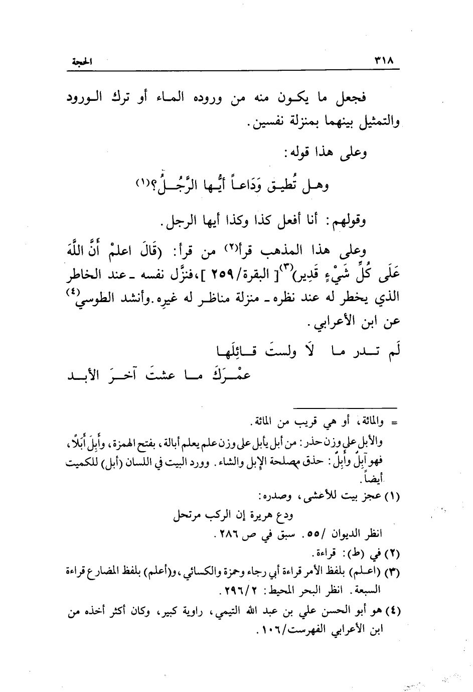 وعلى هذا المذهب قرأ «2» من قرأ: قالَ أَعْلَمُ أَنَّ اللَّهَ عَلى كُلِّ شَيْءٍ قَدِيرٌ «3» [البقرة/ 259]، فنزّل نفسه- عند الخاطر الذي يخطر له عند نظره- منزلة مناظر له غيره. وأنشد الطوسي «4» عن ابن الأعرابي.