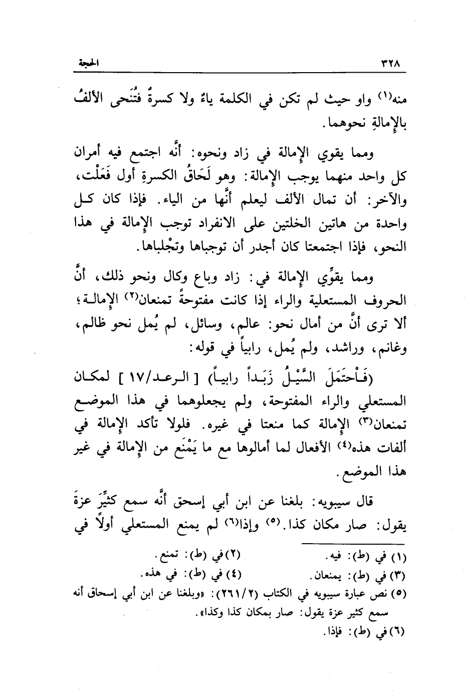 فَاحْتَمَلَ السَّيْلُ زَبَداً رابِياً [الرعد/ 17] لمكان المستعلي والراء المفتوحة، ولم يجعلوهما في هذا الموضع تمنعان «3» الإمالة كما منعتا في غيره. فلولا تأكد الإمالة في ألفات هذه «4» الأفعال لما أمالوها مع ما يمنع من الإمالة في غير هذا الموضع.