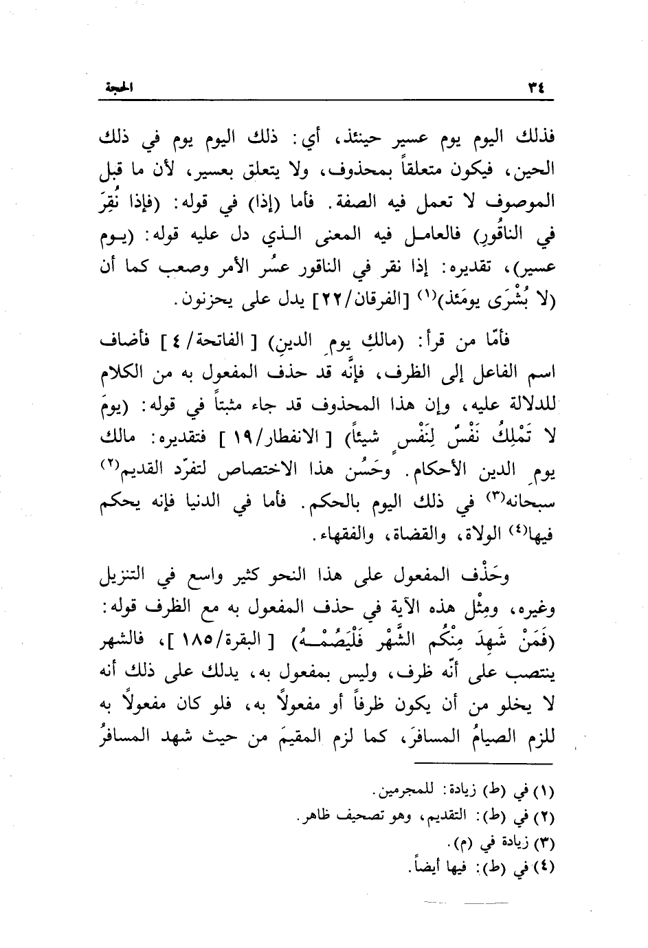فأمّا من قرأ: مالِكِ يَوْمِ الدِّينِ [الفاتحة/ 4] فأضاف اسم الفاعل إلى الظرف، فإنّه قد حذف المفعول به من الكلام للدلالة عليه، وإن هذا المحذوف قد جاء مثبتا في قوله: يَوْمَ لا تَمْلِكُ نَفْسٌ لِنَفْسٍ شَيْئاً [الانفطار/ 19] فتقديره: مالك يوم الدين الأحكام. وحسن هذا الاختصاص لتفرّد القديم «2» سبحانه «3» في ذلك اليوم بالحكم. فأما في الدنيا فإنه يحكم فيها «4» الولاة، والقضاة، والفقهاء.