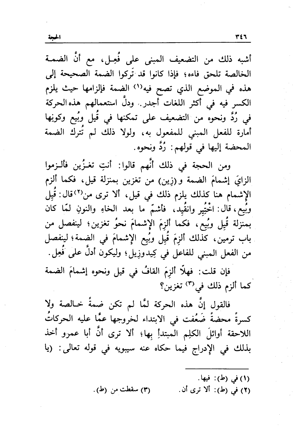 ومن الحجة في ذلك أنّهم قالوا: أنت تغزين فألزموا الزاي إشمام الضمة و (زين) من تغزين بمنزلة قيل، فكما ألزم الإشمام هنا كذلك يلزم ذلك في قيل، ألا ترى من «2» قال: قيل وبيع، قال: اختير وانقيد، فأشمّ ما بعد الخاء والنون لمّا كان بمنزلة قيل وبيع، فكما ألزم الإشمام نحو تغزين، لينفصل من باب ترمين، كذلك ألزم قيل وبيع الإشمام في الضمة، لينفصل من الفعل المبني للفاعل في كيد وزيل، وليكون أدلّ على فعل.