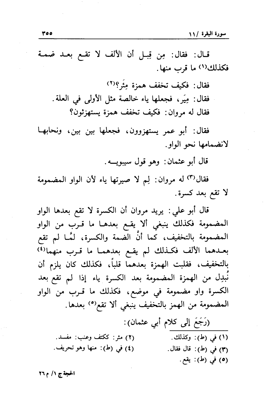 فقال: فكيف تخفف همزة مئر؟ «2» فقال: مير، فجعلها ياء خالصة مثل الأولى في العلة.