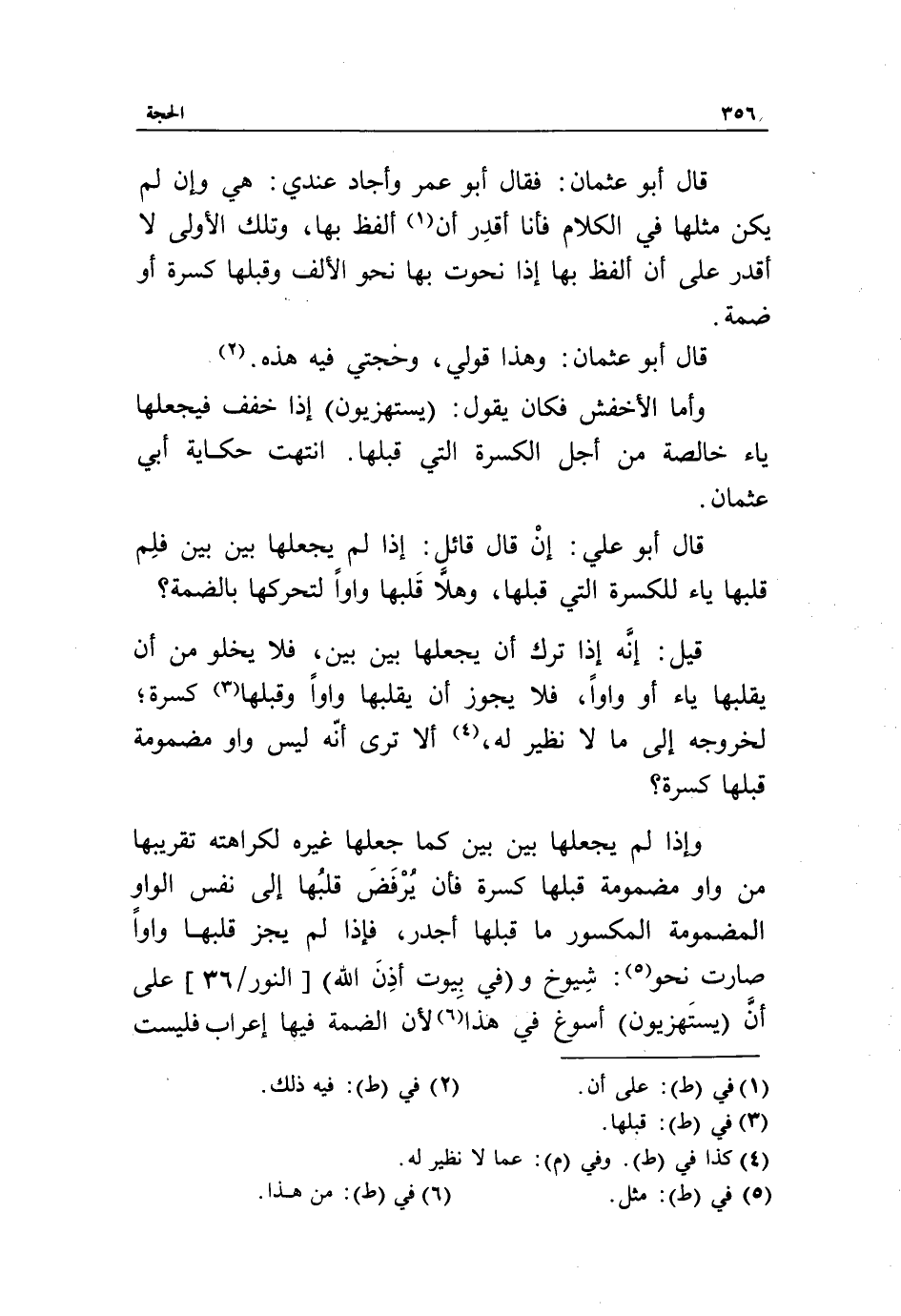 قال أبو عثمان: فقال أبو عمر وأجاد عندي: هي وإن لم يكن مثلها في الكلام فأنا أقدر أن «1» ألفظ بها، وتلك الأولى لا أقدر على أن ألفظ بها إذا نحوت بها نحو الألف وقبلها كسرة أو ضمة.