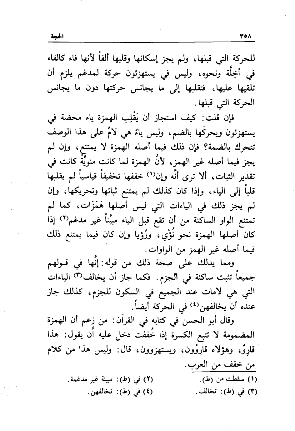 وقال أبو الحسن في كتابه في القرآن: من زعم أن الهمزة المضمومة لا تتبع الكسرة إذا خففت دخل عليه أن يقول: هذا قارو، وهؤلاء قاروون، ويستهزوون، قال: وليس