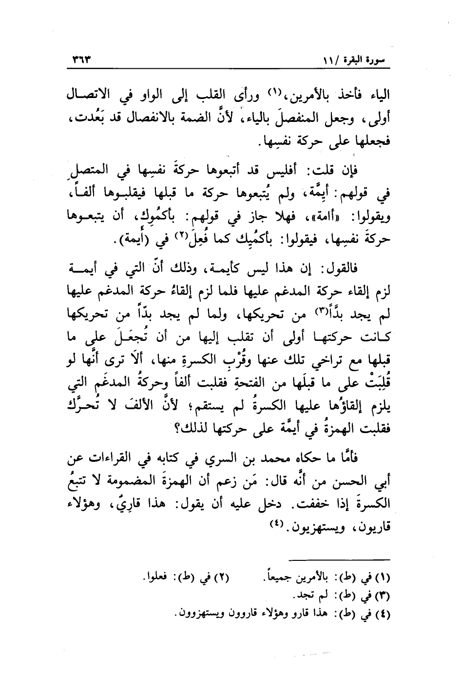 فأمّا ما حكاه محمد بن السري في كتابه في القراءات عن أبي الحسن من أنّه قال: من زعم أن الهمزة المضمومة لا تتبع الكسرة إذا خففت. دخل عليه أن يقول: هذا قاري، وهؤلاء قاريون، ويستهزيون. «4»