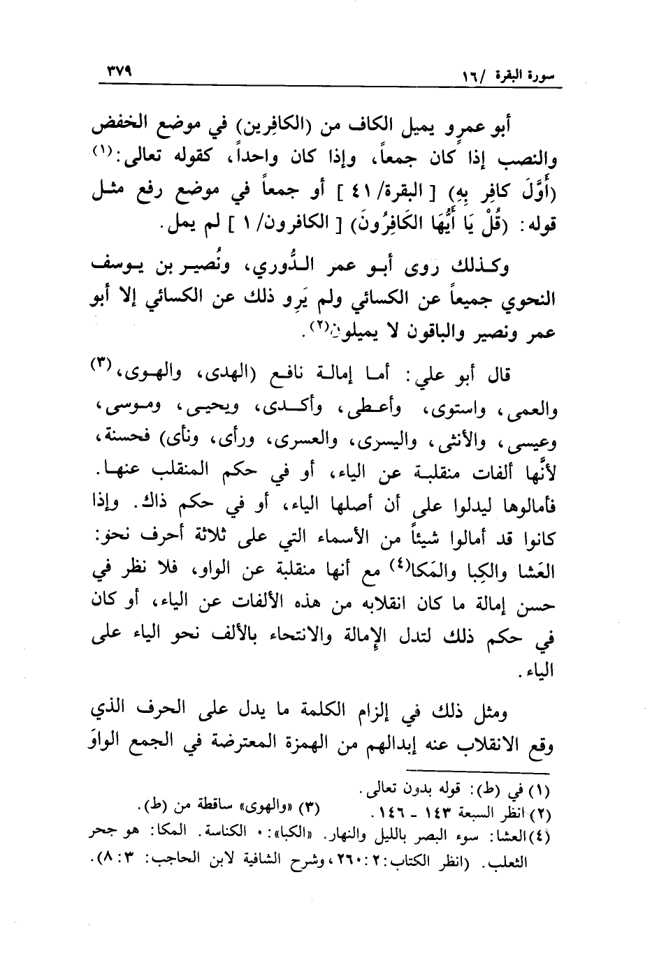 أبو عمرو يميل الكاف من (الكافرين) في موضع الخفض والنصب إذا كان جمعا، وإذا كان واحدا، كقوله تعالى: «1» أَوَّلَ كافِرٍ بِهِ [البقرة/ 41] أو جمعا في موضع رفع مثل قوله: قُلْ يا أَيُّهَا الْكافِرُونَ [الكافرون/ 1] لم يمل.