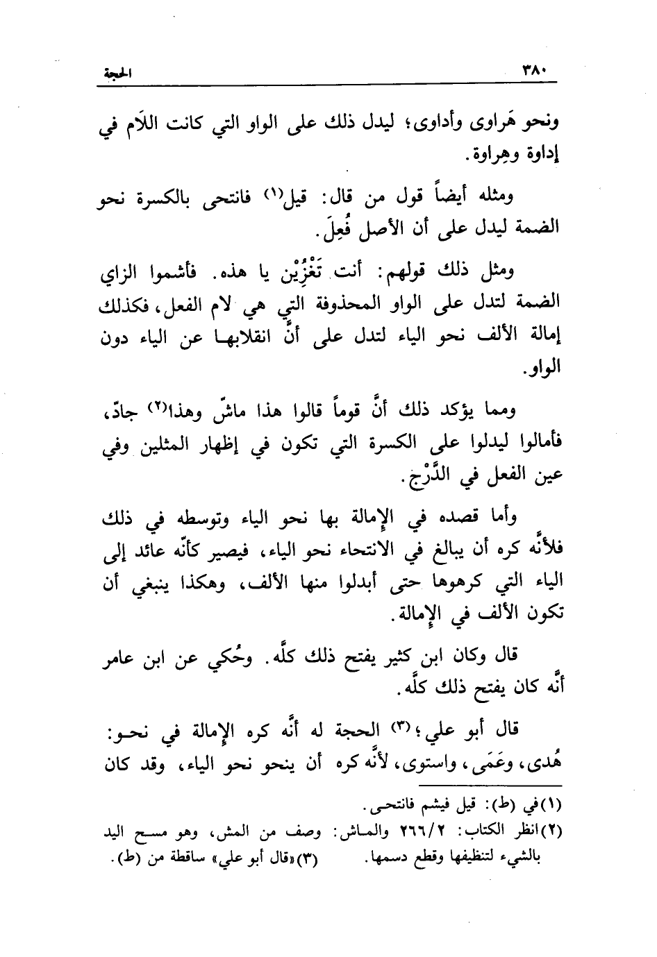 قال أبو علي، «3» الحجة له أنّه كره الإمالة في نحو: