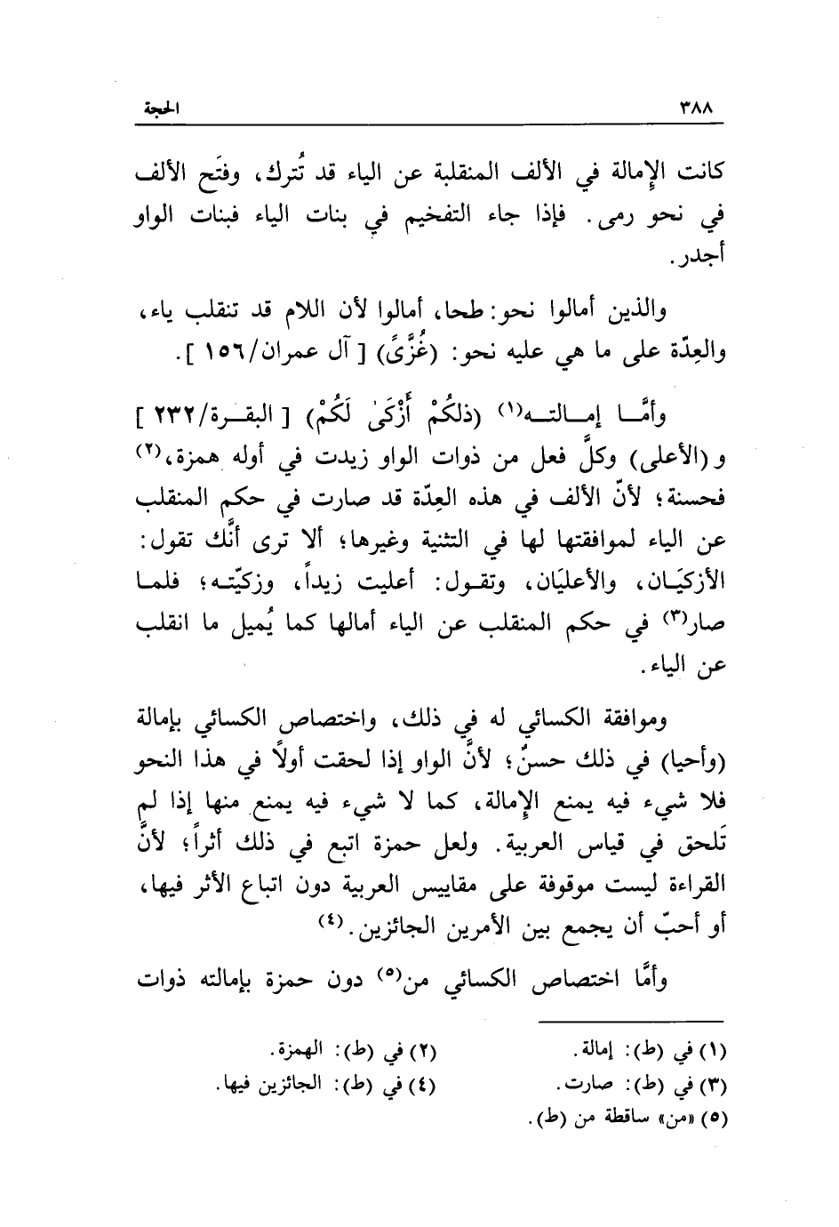 وأمّا إمالته «1» ذلِكُمْ أَزْكى لَكُمْ [البقرة/ 232] و (الأعلى) وكلّ فعل من ذوات الواو زيدت في أوله همزة، «2» فحسنة، لأنّ الألف في هذه العدّة قد صارت في حكم المنقلب عن الياء لموافقتها لها في التثنية وغيرها، ألا ترى أنّك تقول: