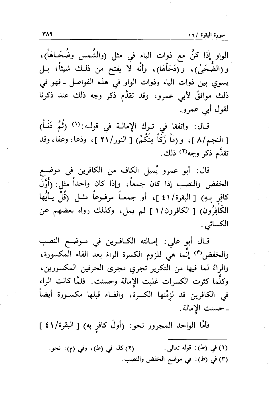 قال: واتفقا في ترك الإمالة في قوله: «1» ثُمَّ دَنا [النجم/ 8]، وما زكا منكم [النور/ 21]، ودعا، وعفا، وقد تقدّم ذكر وجه «2» ذلك.