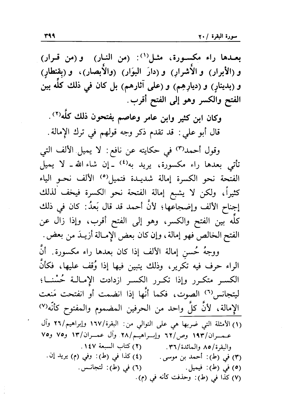 بعدها راء مكسورة، مثل «1»: مِنَ النَّارِ ومِنْ قَرارٍ والْأَبْرارِ والْأَشْرارِ ودارَ الْبَوارِ والْأَبْصارِ، وبِقِنْطارٍ وبِدِينارٍ ودِيارِهِمْ وعَلى آثارِهِمْ بل كان في ذلك كلّه بين الفتح والكسر وهو إلى الفتح أقرب.