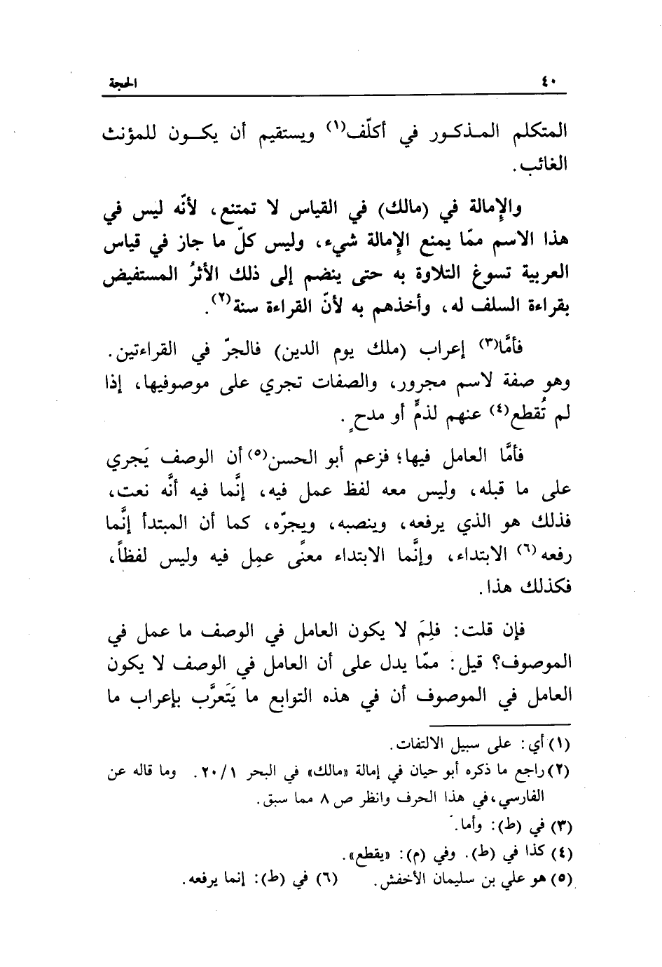 (2) راجع ما ذكره أبو حيان في إمالة «مالك» في البحر 1/ 20. وما قاله عن الفارسي، في هذا الحرف وانظر ص 8 مما سبق.