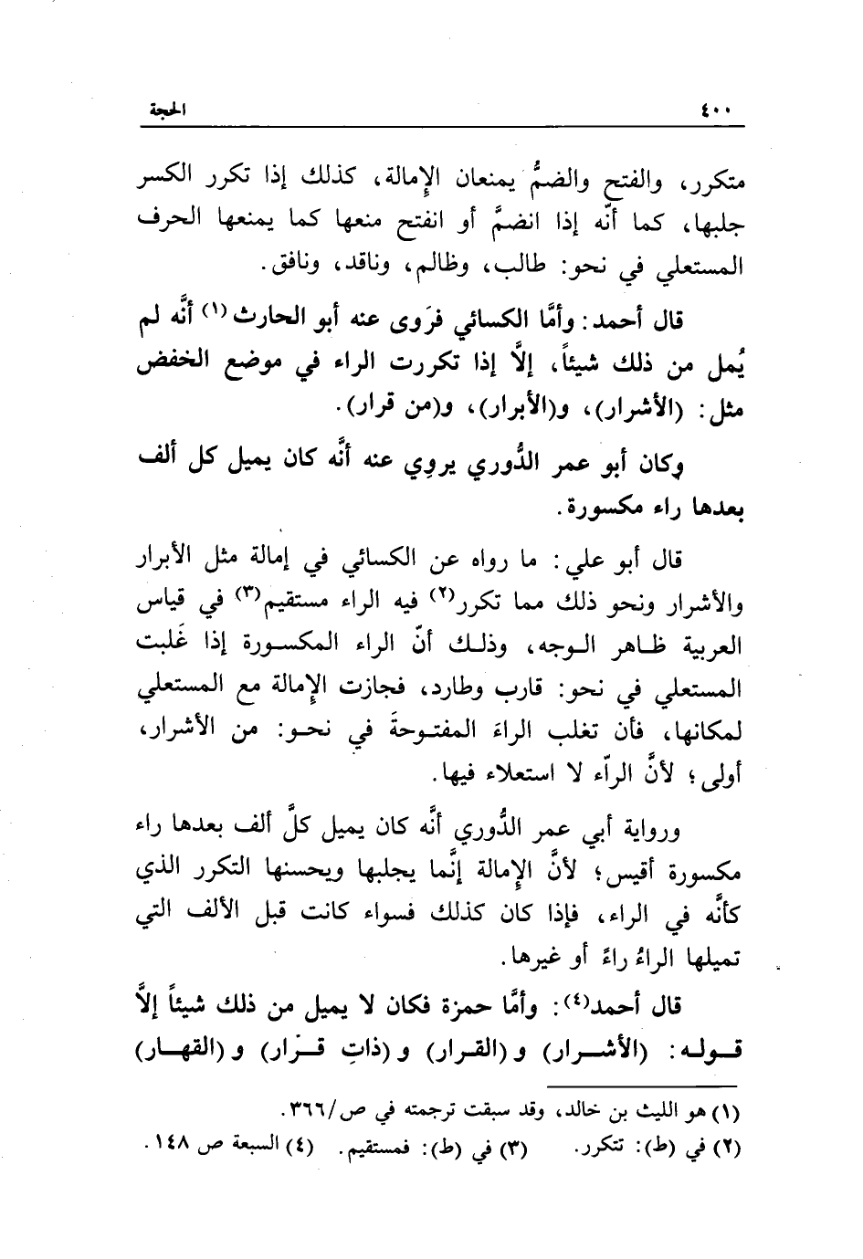 قال أحمد «4»: وأمّا حمزة فكان لا يميل من ذلك شيئا إلّا قوله: (الأشرار) و (القرار) و (ذات قرار) و (القهار)