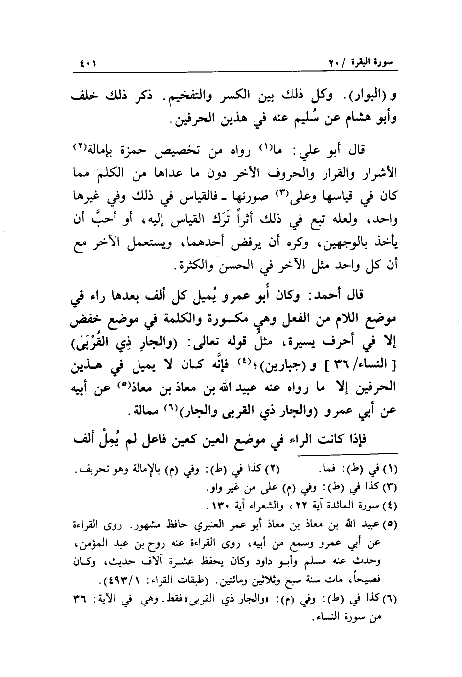 قال أحمد: وكان أبو عمرو يميل كل ألف بعدها راء في موضع اللام من الفعل وهي مكسورة والكلمة في موضع خفض إلا في أحرف يسيرة، مثل قوله تعالى: وَالْجارِ ذِي الْقُرْبى [النساء/ 36] و (جبارين)؛ «4» فإنّه كان لا يميل في هذين الحرفين إلا ما رواه عنه عبيد الله بن معاذ بن معاذ «5» عن أبيه عن أبي عمرو (والجار ذي القربى والجار) «6» ممالة.
