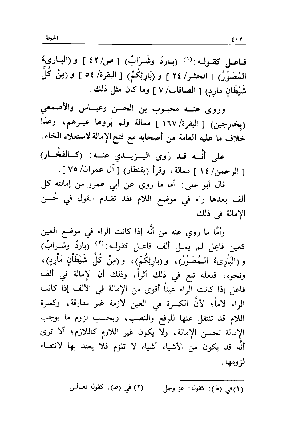 قال أبو علي: أما ما روي عن أبي عمرو من إمالته كل ألف بعدها راء في موضع اللام فقد تقدم القول في حسن الإمالة في ذلك.