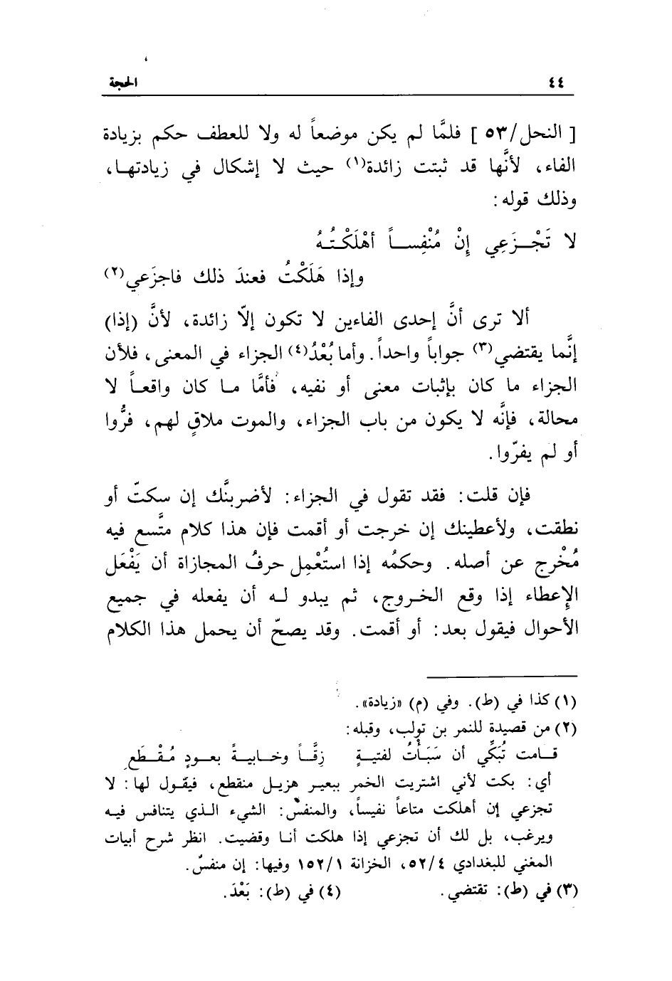 [النحل/ 53] فلمّا لم يكن موضعا له ولا للعطف حكم بزيادة الفاء، لأنّها قد ثبتت زائدة «1» حيث لا إشكال في زيادتها، وذلك قوله: