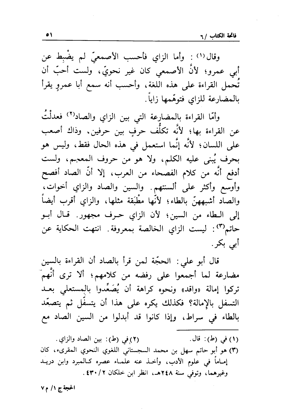 (3) هو أبو حاتم سهل بن محمد السجستاني اللغوي النحوي المقرئ، كان إماما في علوم الأدب، وأخذ عنه علماء عصره كالمبرد وابن دريد وغيرهما، وتوفي سنة 248 هـ، انظر ابن خلكان 2/ 430.