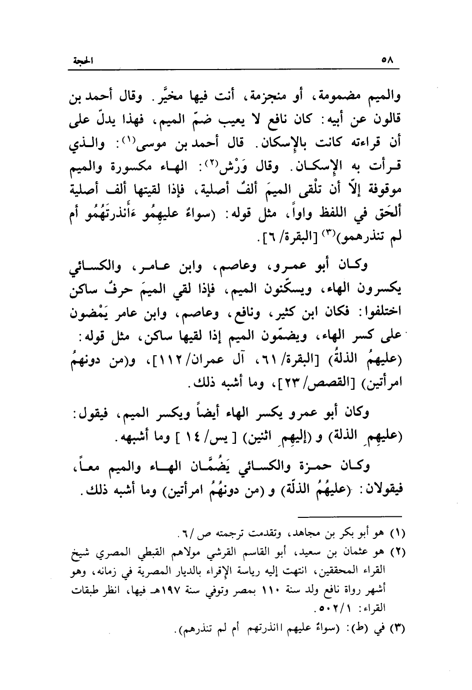 (2) هو عثمان بن سعيد، أبو القاسم القرشي مولاهم القبطي المصري شيخ القراء المحققين، انتهت إليه رئاسة الإقراء بالديار المصرية في زمانه، وهو أشهر رواة نافع ولد سنة 110 بمصر وتوفي سنة 197 هـ فيها، انظر طبقات القراء: 1/ 502.