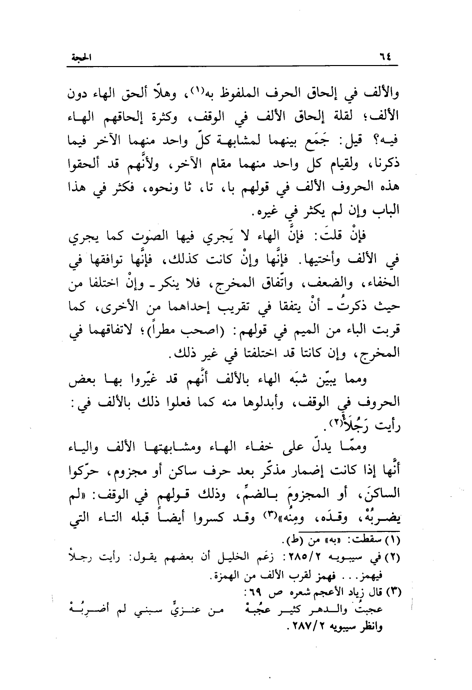 وممّا يدلّ على خفاء الهاء ومشابهتها الألف والياء أنّها إذا كانت إضمار مذكّر بعد حرف ساكن أو مجزوم، حرّكوا الساكن، أو المجزوم بالضمّ، وذلك قولهم في الوقف: «لم يضربه، وقده، ومنه» «3» وقد كسروا أيضا قبله التاء التي